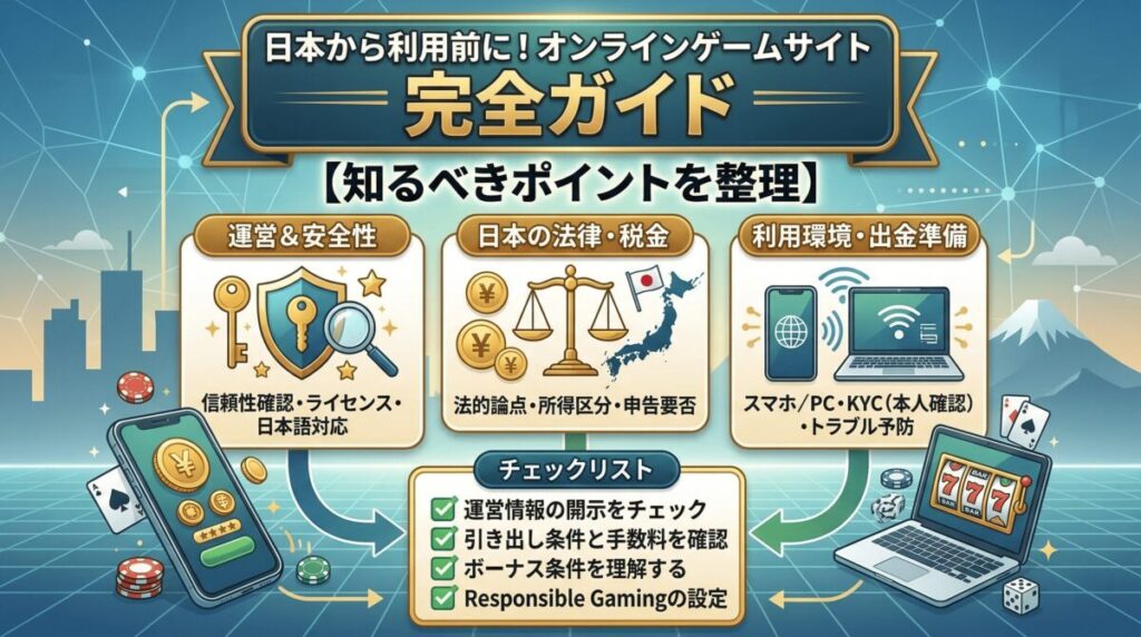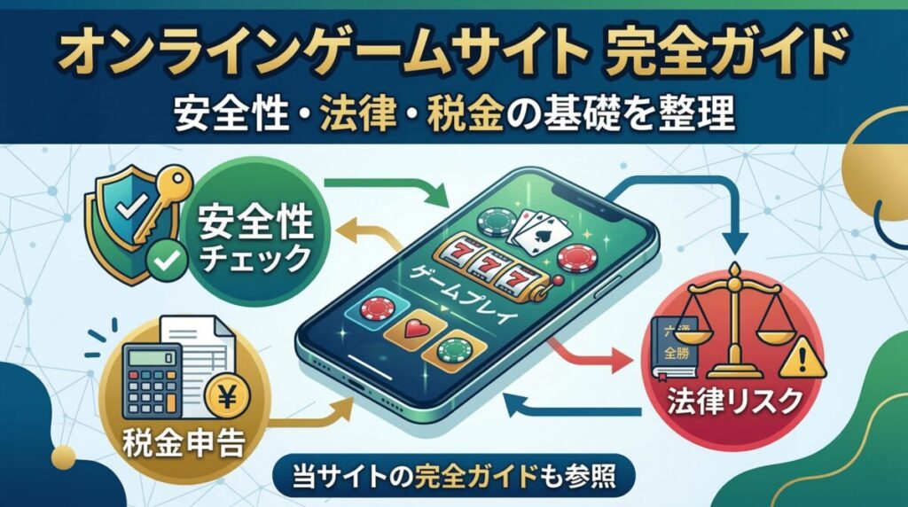 オンラインゲームサイトの基本、遊び方の流れ、安全性の見極め方、日本での法律・税金の注意点を一般論として整理します。 -